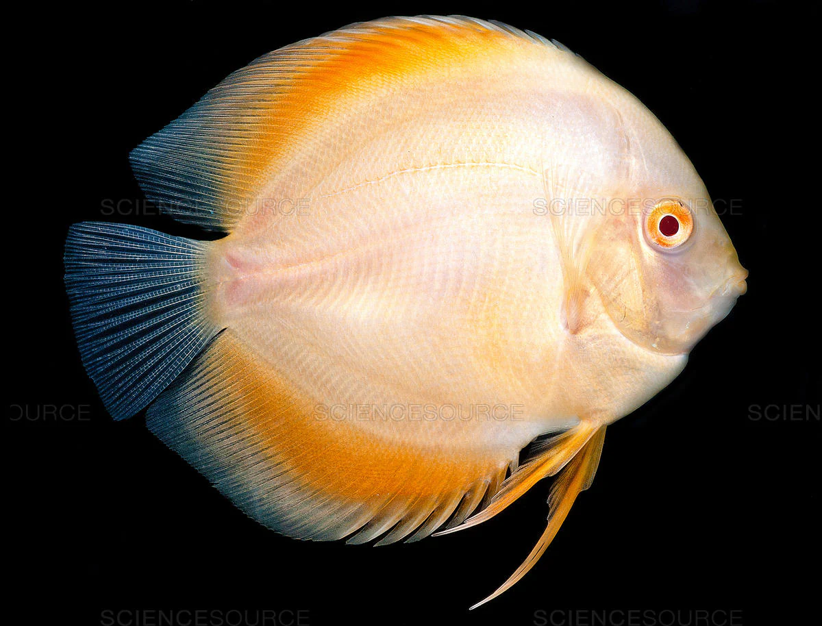 A pale golden discus with red eyes, characteristic of albino varieties, creating a soft and luminous look. ︵‿𓇼 ⋆.˚ 𓆉 𓆝 𓆉 ⋆。⊹ ࣪ ﹏𓊝﹏𓂁﹏𓆝 𓆟 𓆞﹏﹏﹏°:•.🐠*.•🪸.•:°﹏ 𓆝 𓆟﹏𓊝﹏𓂁﹏⊹ ࣪ ˖⋆。˚𓆟 𓆡⋆.˚ 𓇼 ‿︵ Please Note : Yes! Albino Discus are highly sensitive to bright light due to their lack of melanin, which normally protects eyes from harsh lighting. Subdued lighting is essential for their comfort and to highlight their striking red-eye contrast.