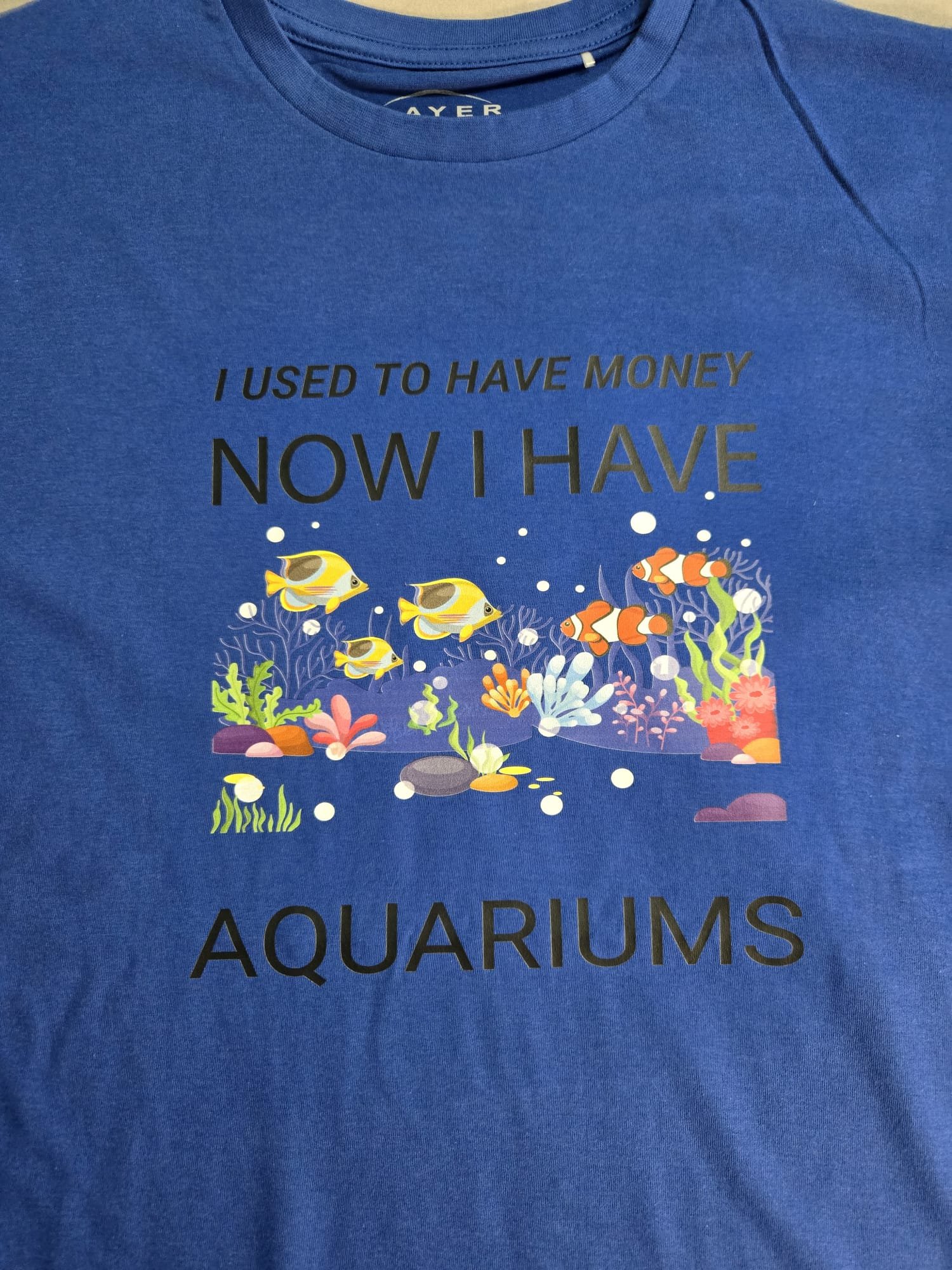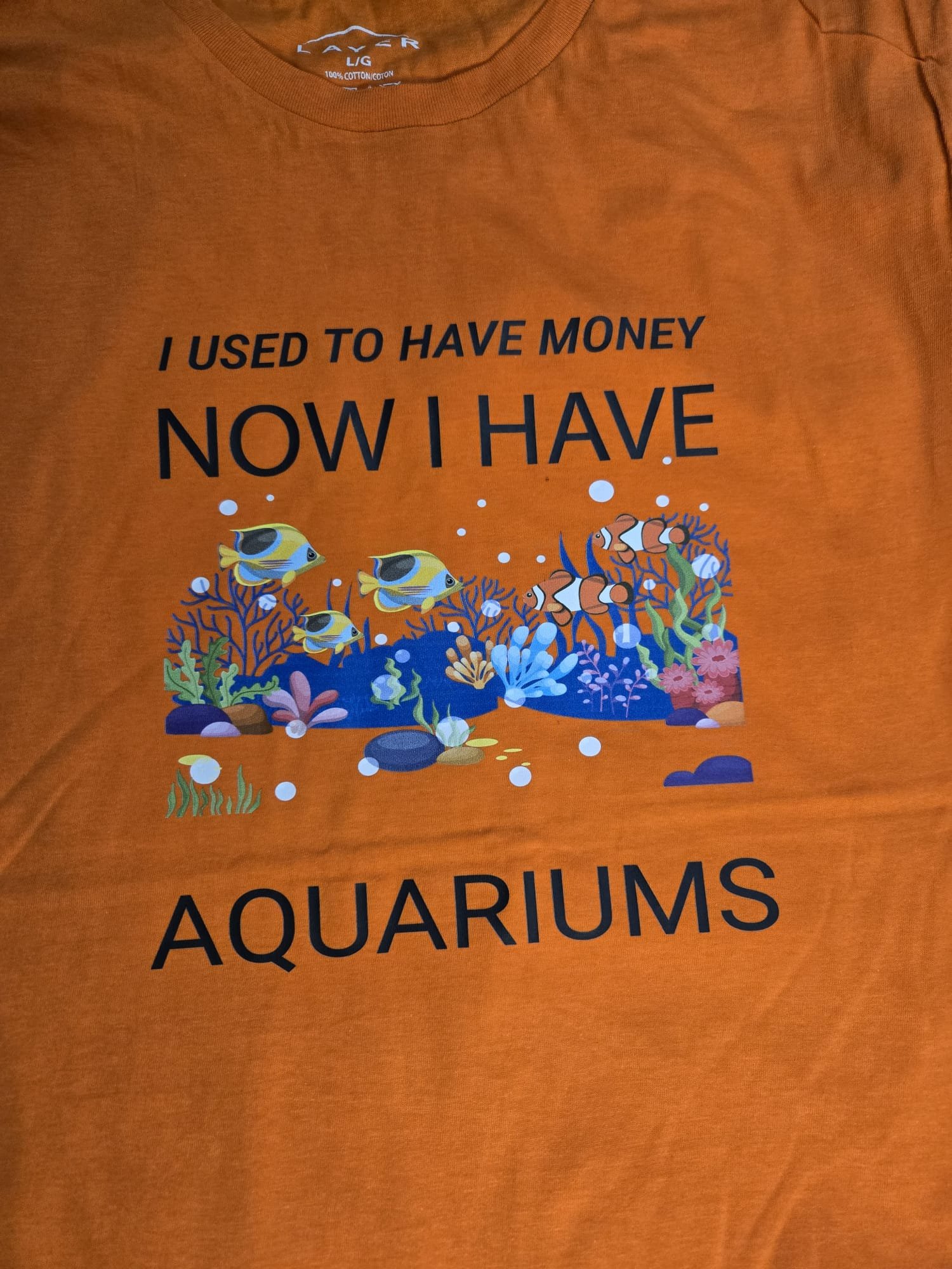 “I Used to Have Money, Now I Have Aquariums” T-Shirt 🐠💸 The Ultimate Fishkeeper Flex – Wear Your Addiction Proudly! Forget diamonds – aquariums are a girl’s/guy’s best friend! Flaunt your fishkeeping obsession with this ultra-soft, 100% cotton tee. Perfect for tank maintenance days, fish store runs, or justifying your hobby to concerned relatives. $12.99 – a small price for big aquatic pride!
